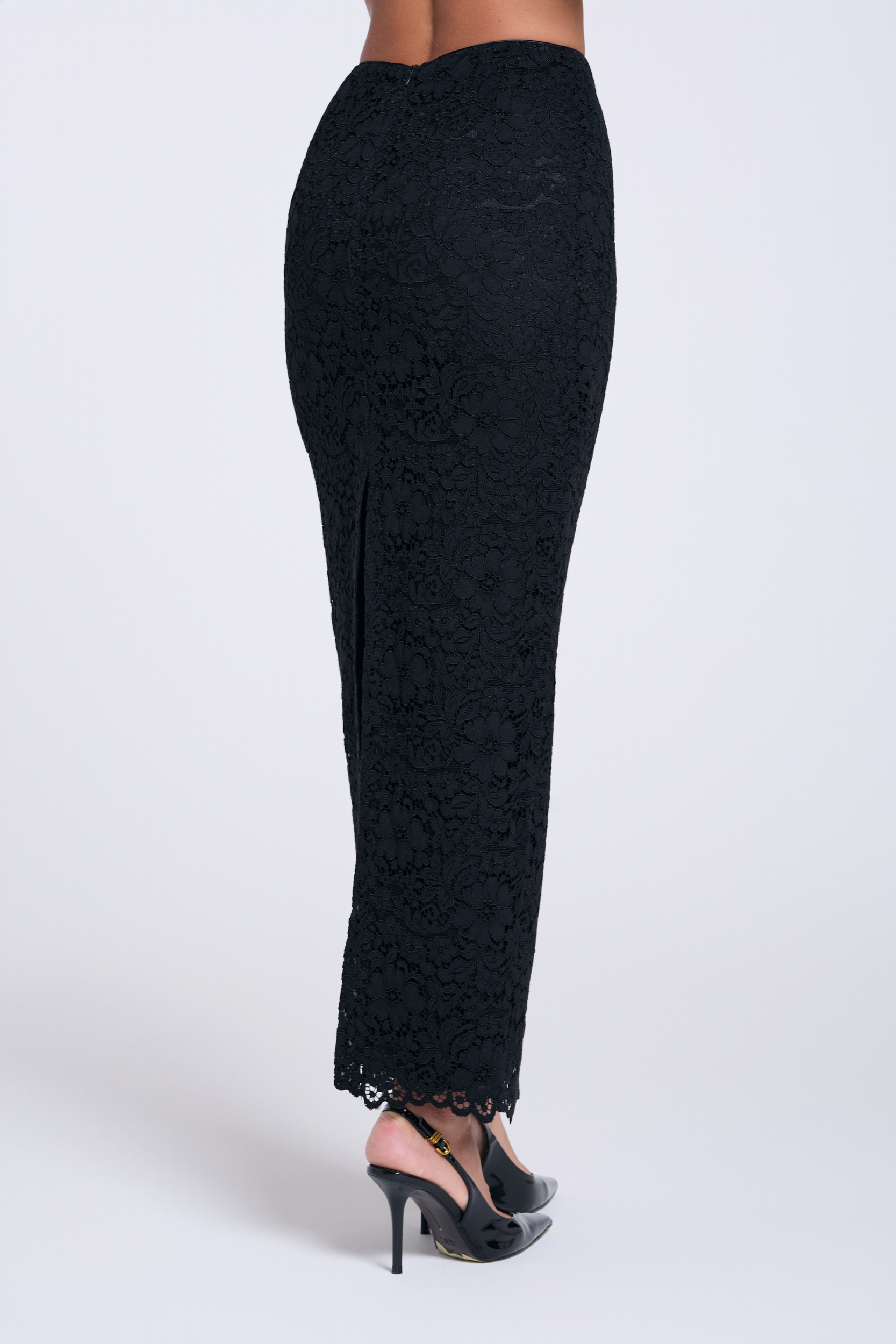 Długa spódnica uszyta z wyjątkowo stylowej koronki łączy minimalistyczny krój z wyrazistą fakturą, która dodaje stylizacji niepowtarzalnego charakteru. Prosty, dopasowany fason subtelnie zwęża się ku dołowi. Rozcięcie z tyłu zapewnia swobodę ruchu. Spódnica zapinana jest na kryty zamek. Zastosowanie wiskozowej podszewki sprawia, że nie prześwituje i jest przyjemna w noszeniu. Model wykończono w pasie lamówką dla czystego, eleganckiego efektu.