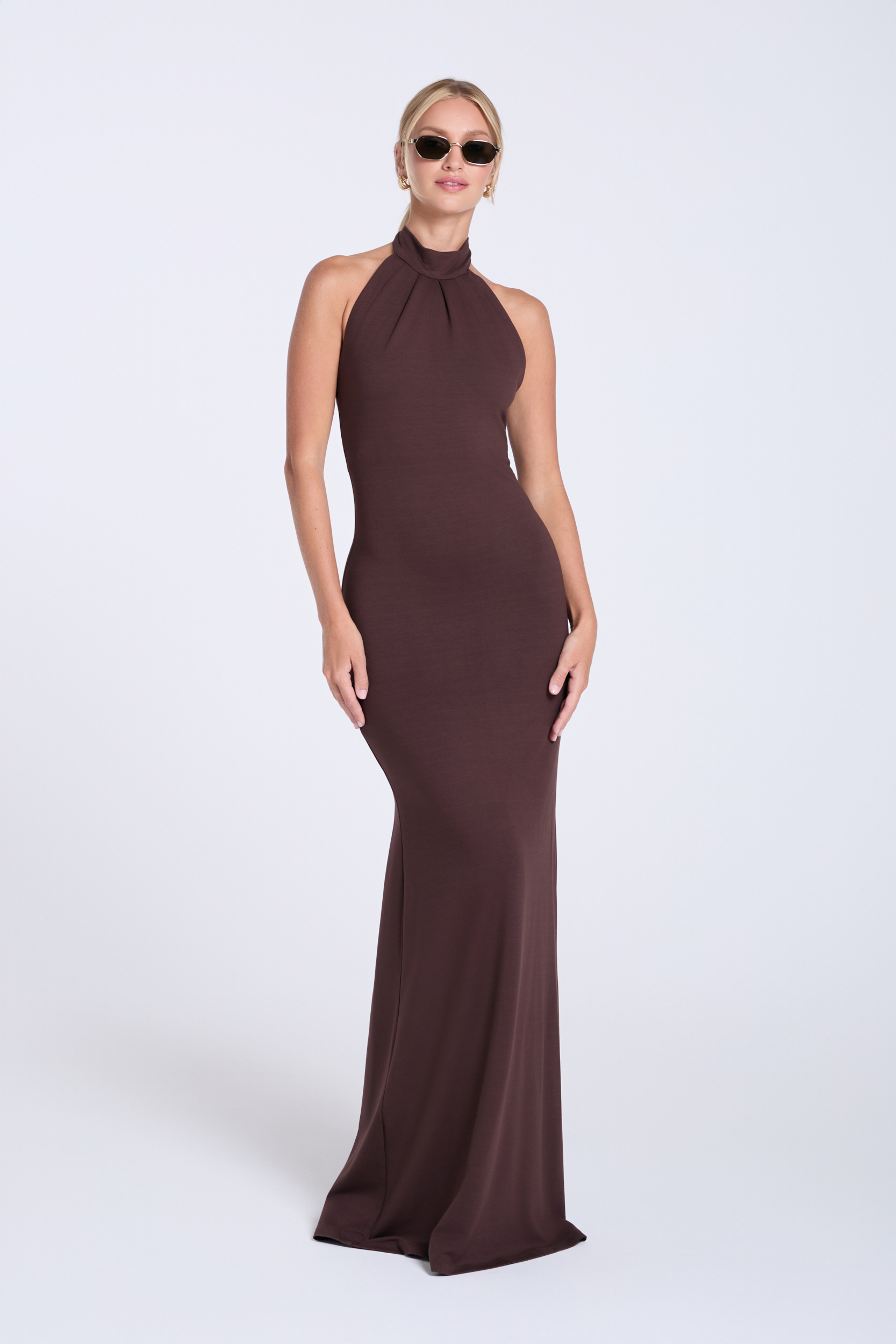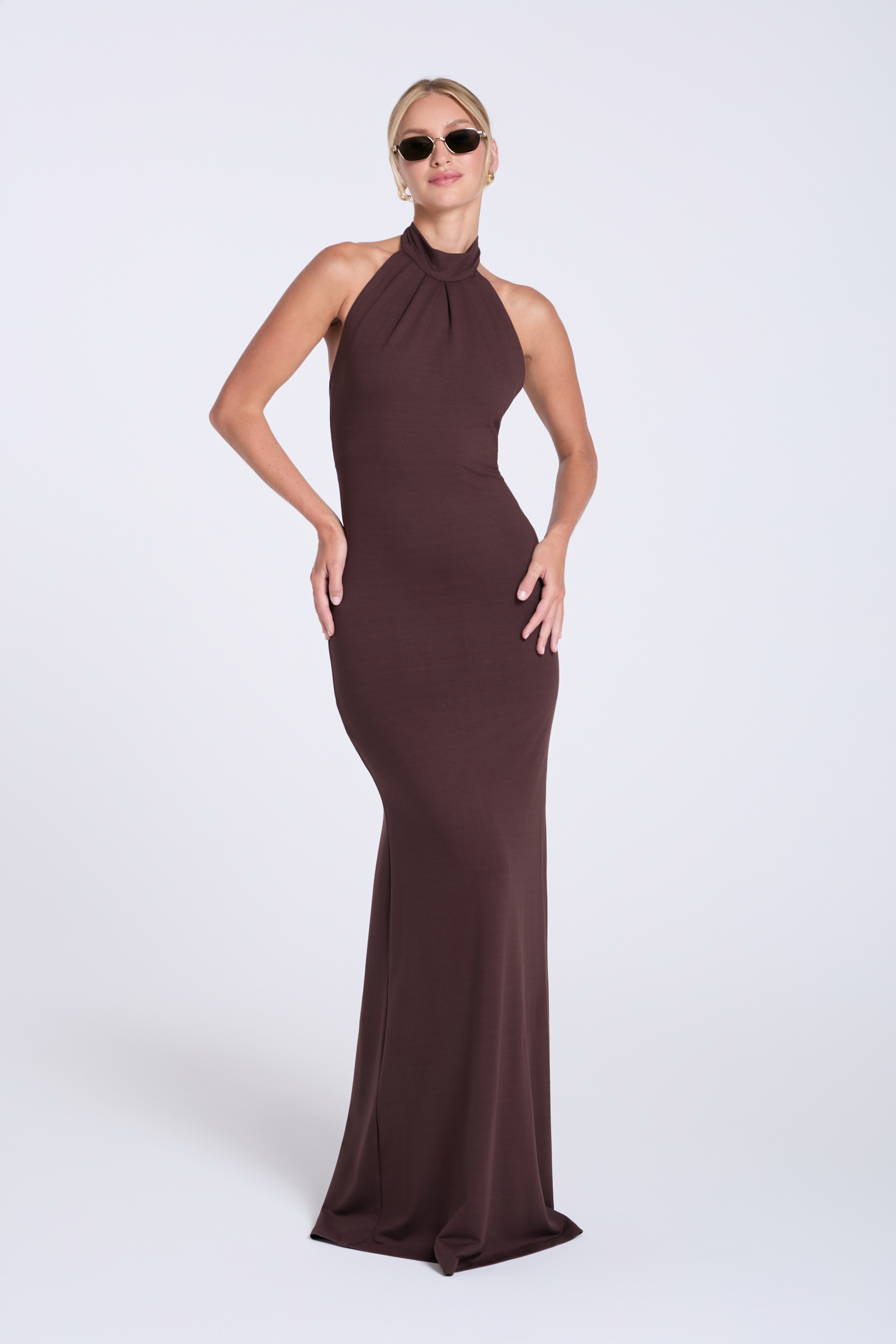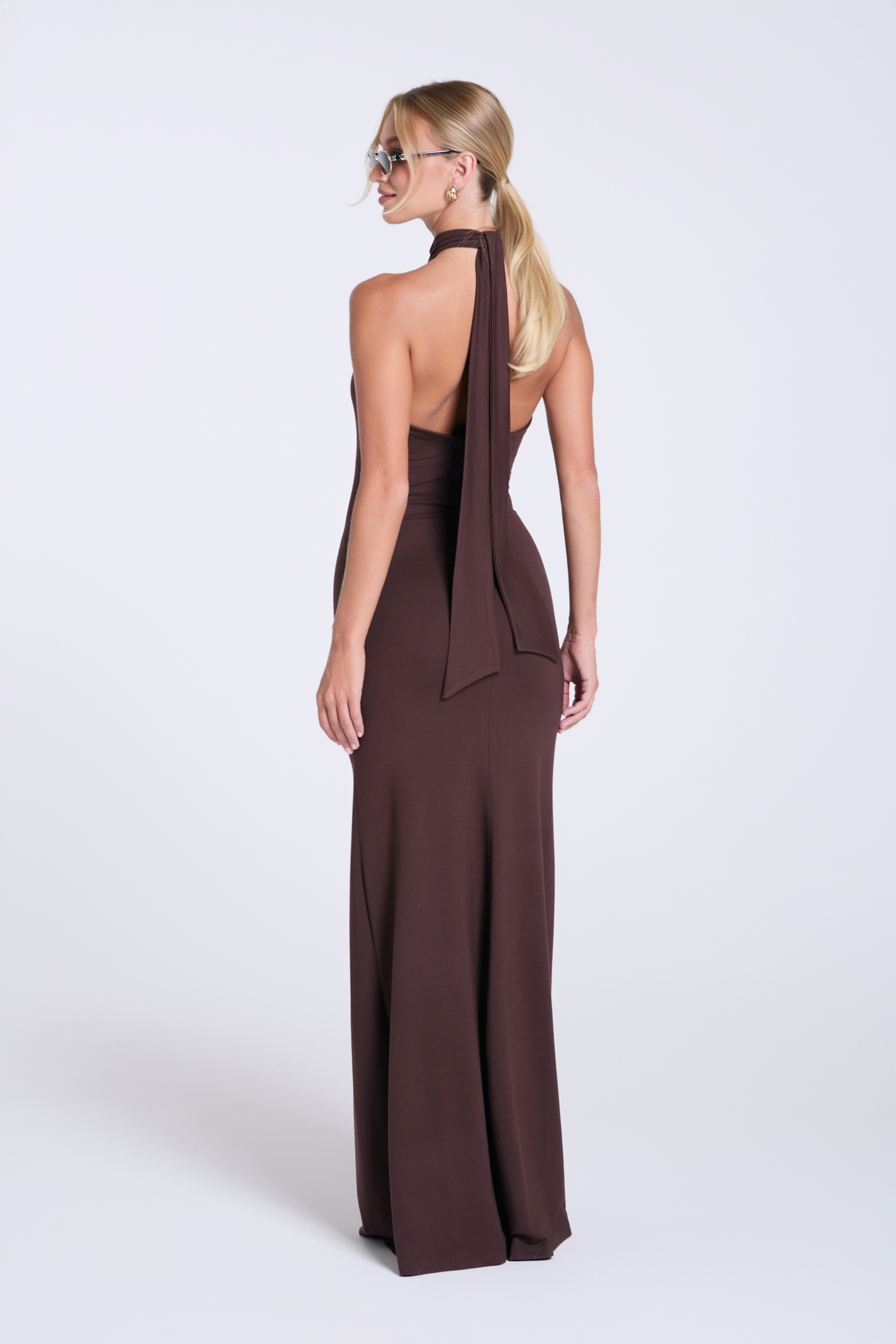Stylowa, dopasowana sukienka maxi w kolorze brązu, która przyciąga uwagę swoją zmysłową formą. Uszyta z miękkiego mikromodalu, subtelnie podkreśla sylwetkę. Od wysokości kolan sukienka delikatnie się rozszerza. Góra tego modelu wyróżnia się efektownym marszczeniem z zabudowaną stójką, która przechodzi w długą, charakterystyczną szarfę wiązaną z tyłu na szyi. Odkryte plecy nadają projektowi nowoczesnego i niezwykle kobiecego charakteru, balansując klasykę z nutą odwagi.