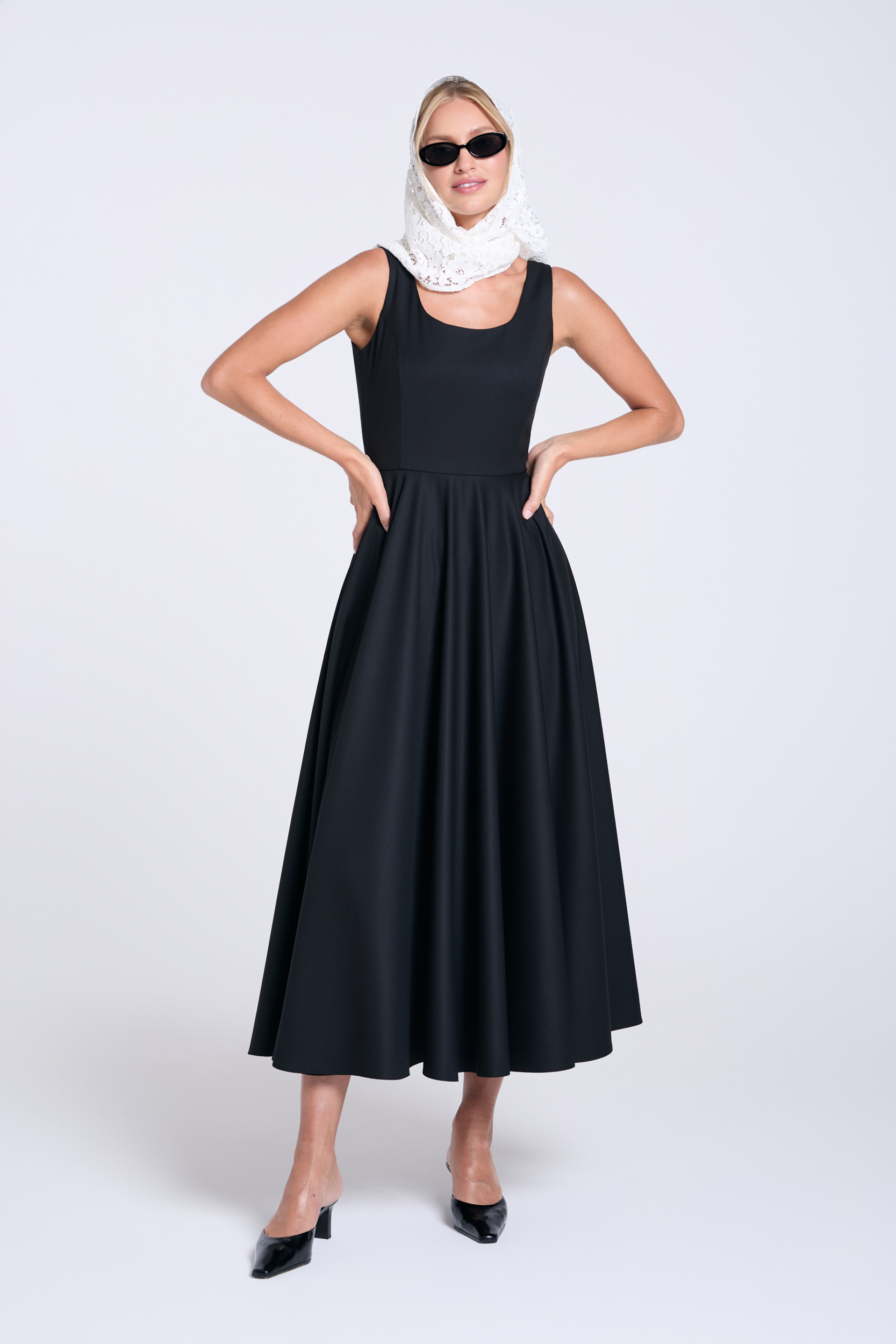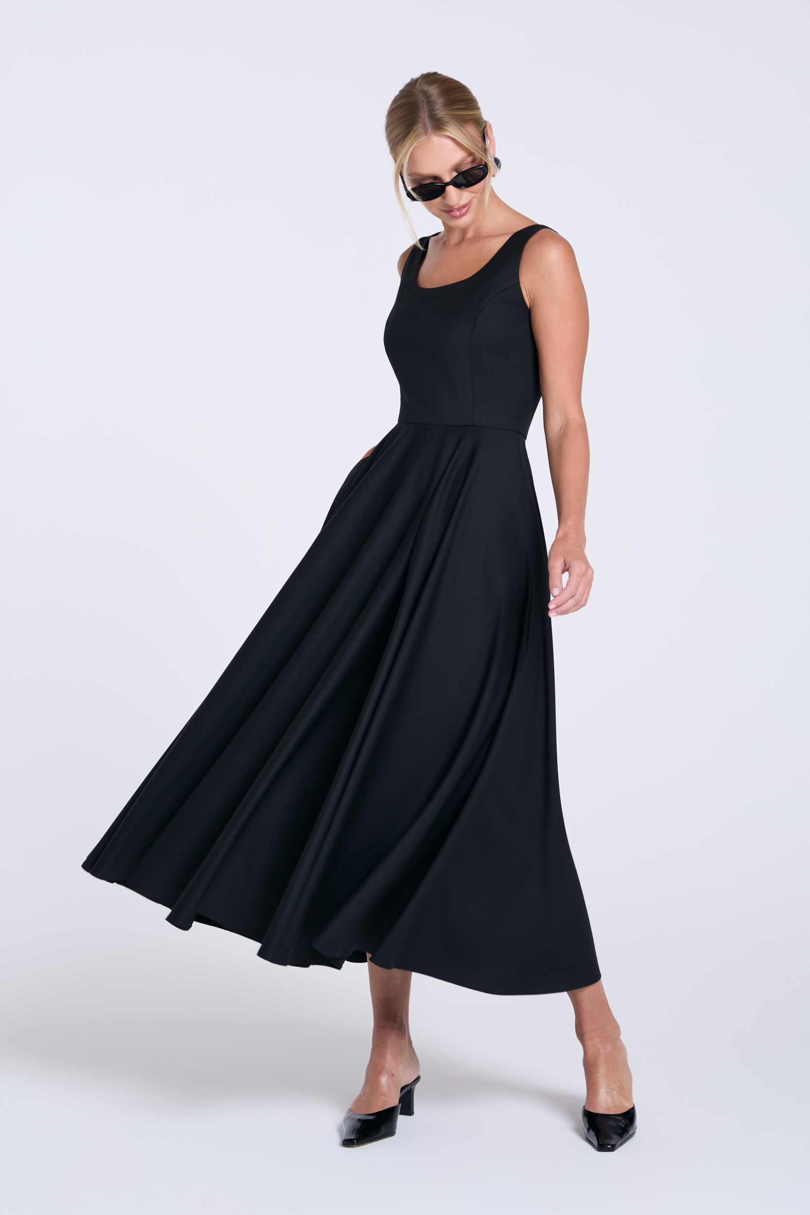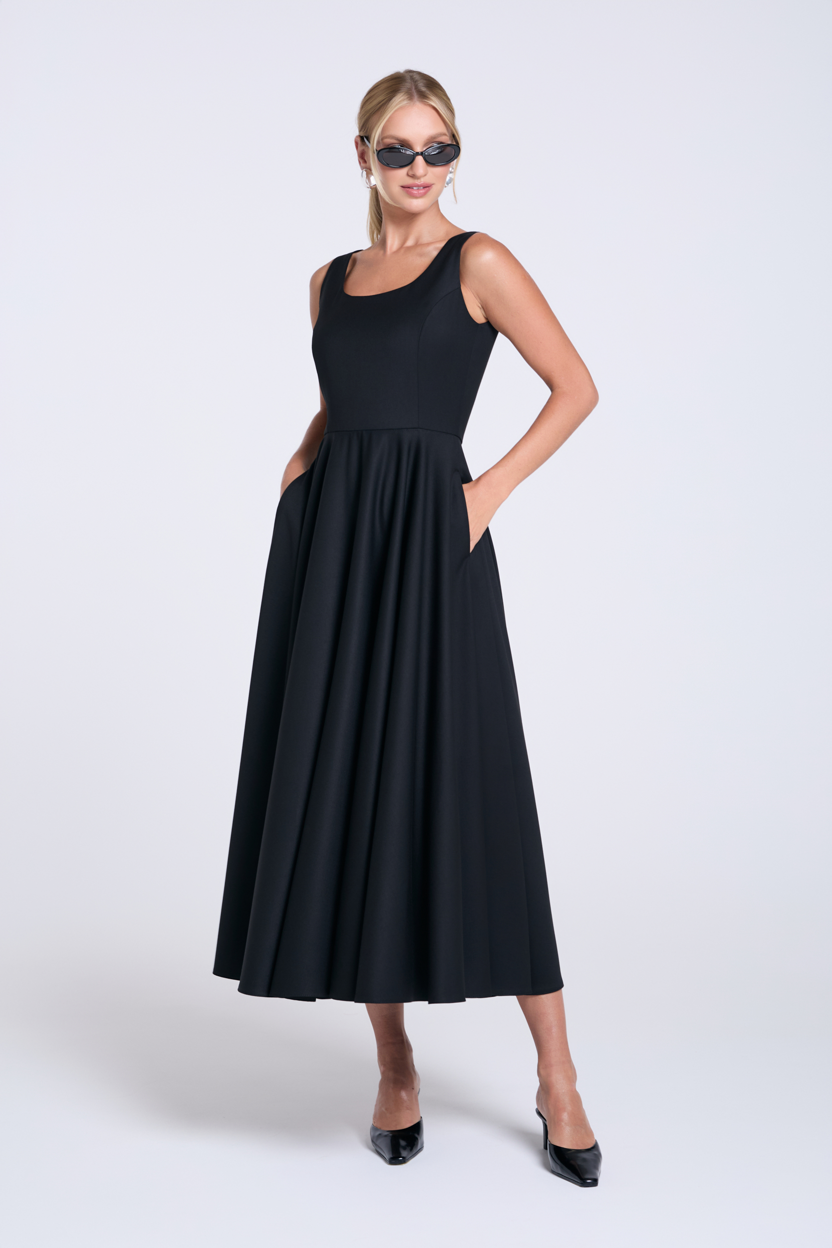 Sukienka Kate to współczesna interpretacja ponadczasowej elegancji. Uszyta z mięsistej wiskozy, łączy dopasowaną górę z szerokim dołem skrojonym z koła, który miękko układa się w ruchu. Sukienka pięknie podkreśla talię. Okrągły dekolt i szerokie ramiączka nadają jej klasycznej prostoty. Praktyczne, boczne kieszenie wprowadzają nowoczesny charakter. Zapinana na kryty zamek z tyłu.