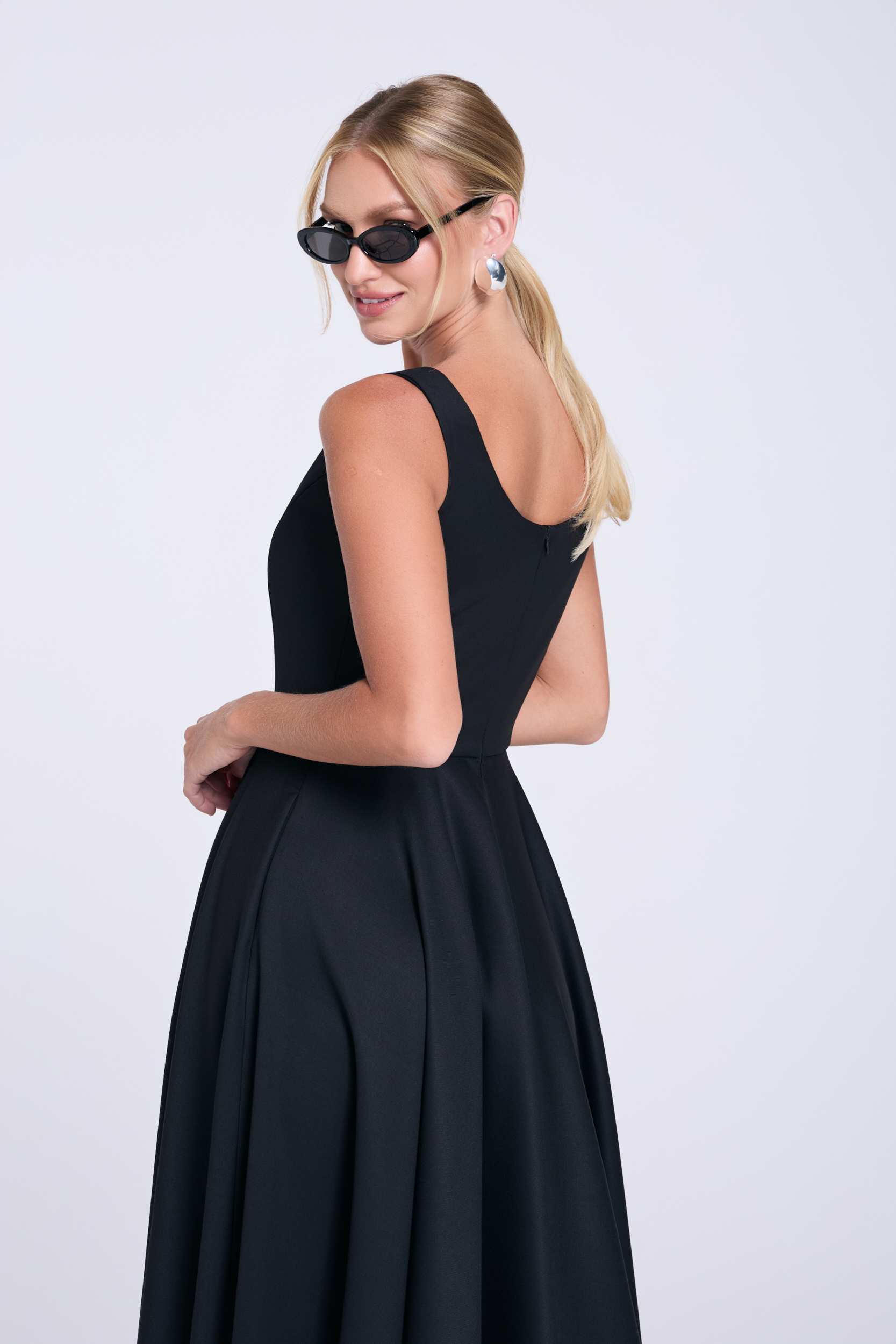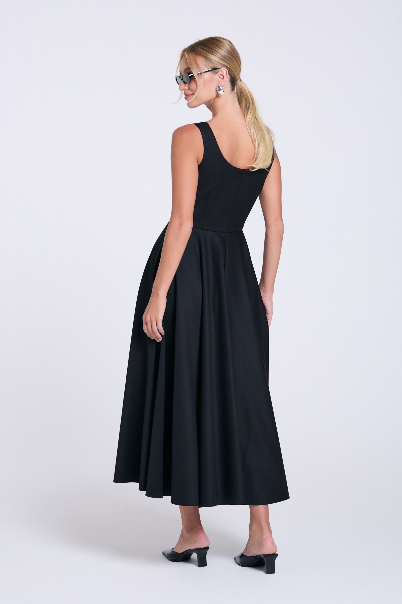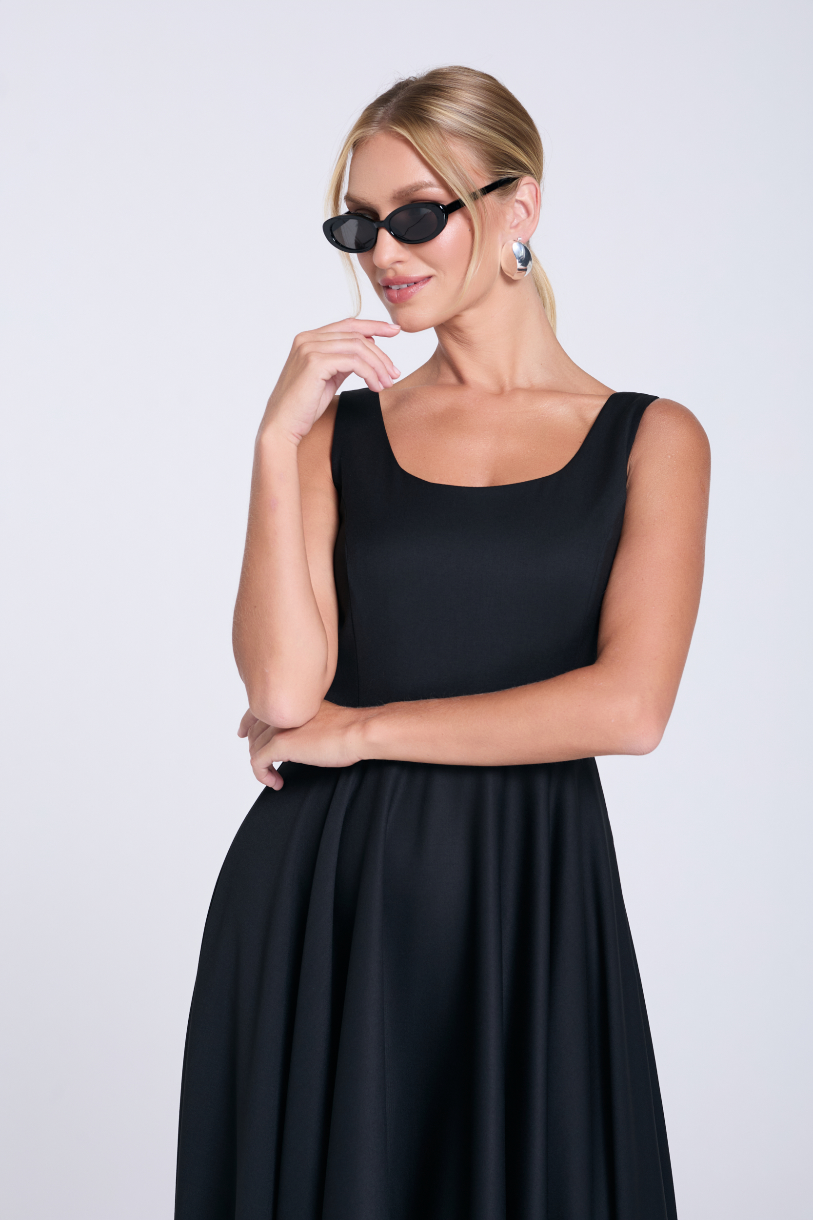 Sukienka Kate to współczesna interpretacja ponadczasowej elegancji. Uszyta z mięsistej wiskozy, łączy dopasowaną górę z szerokim dołem skrojonym z koła, który miękko układa się w ruchu. Sukienka pięknie podkreśla talię. Okrągły dekolt i szerokie ramiączka nadają jej klasycznej prostoty. Praktyczne, boczne kieszenie wprowadzają nowoczesny charakter. Zapinana na kryty zamek z tyłu.