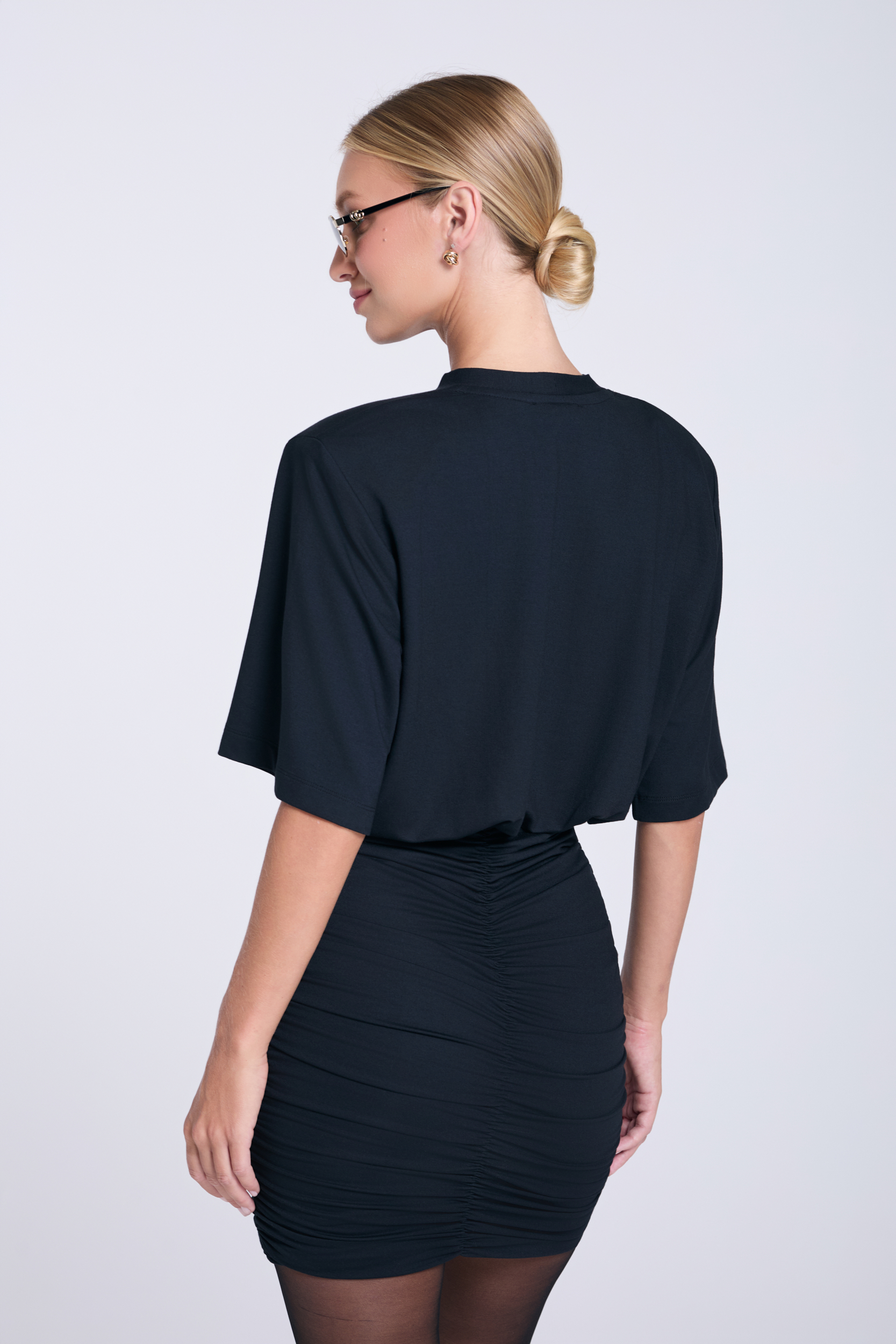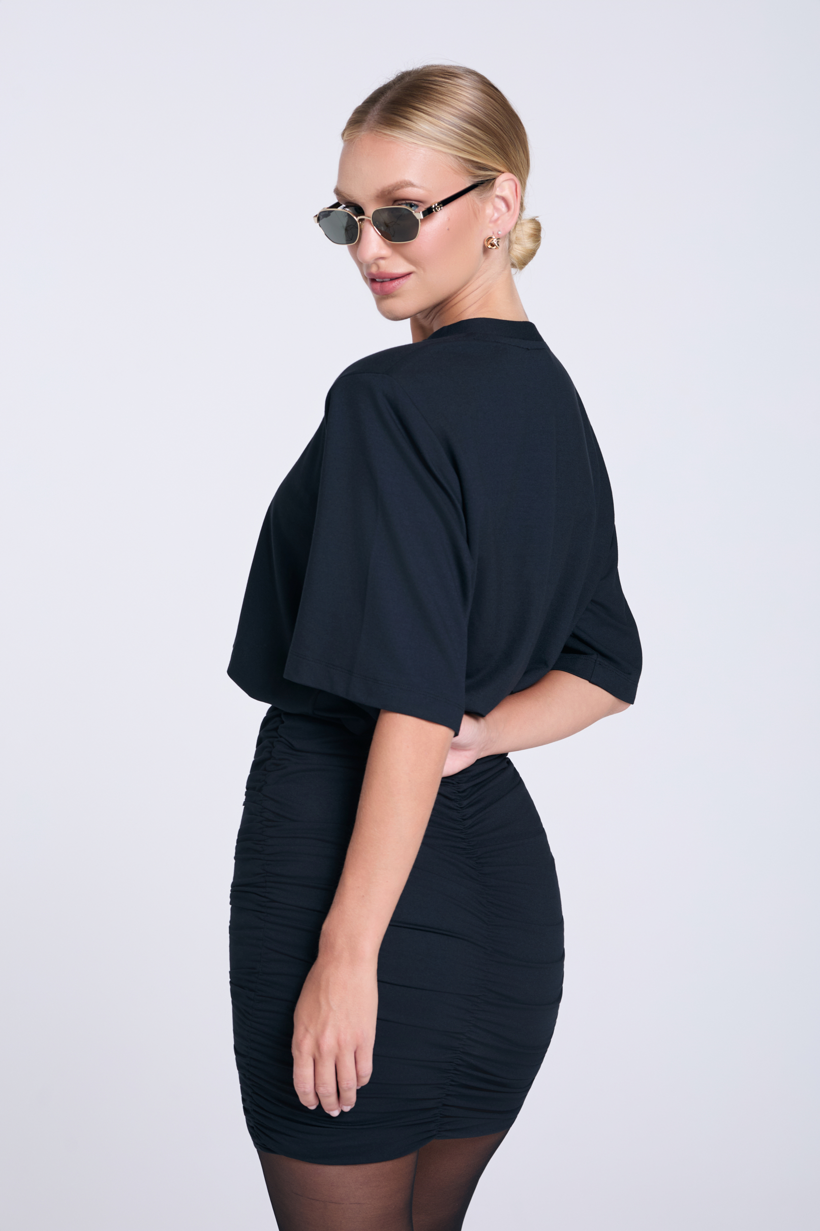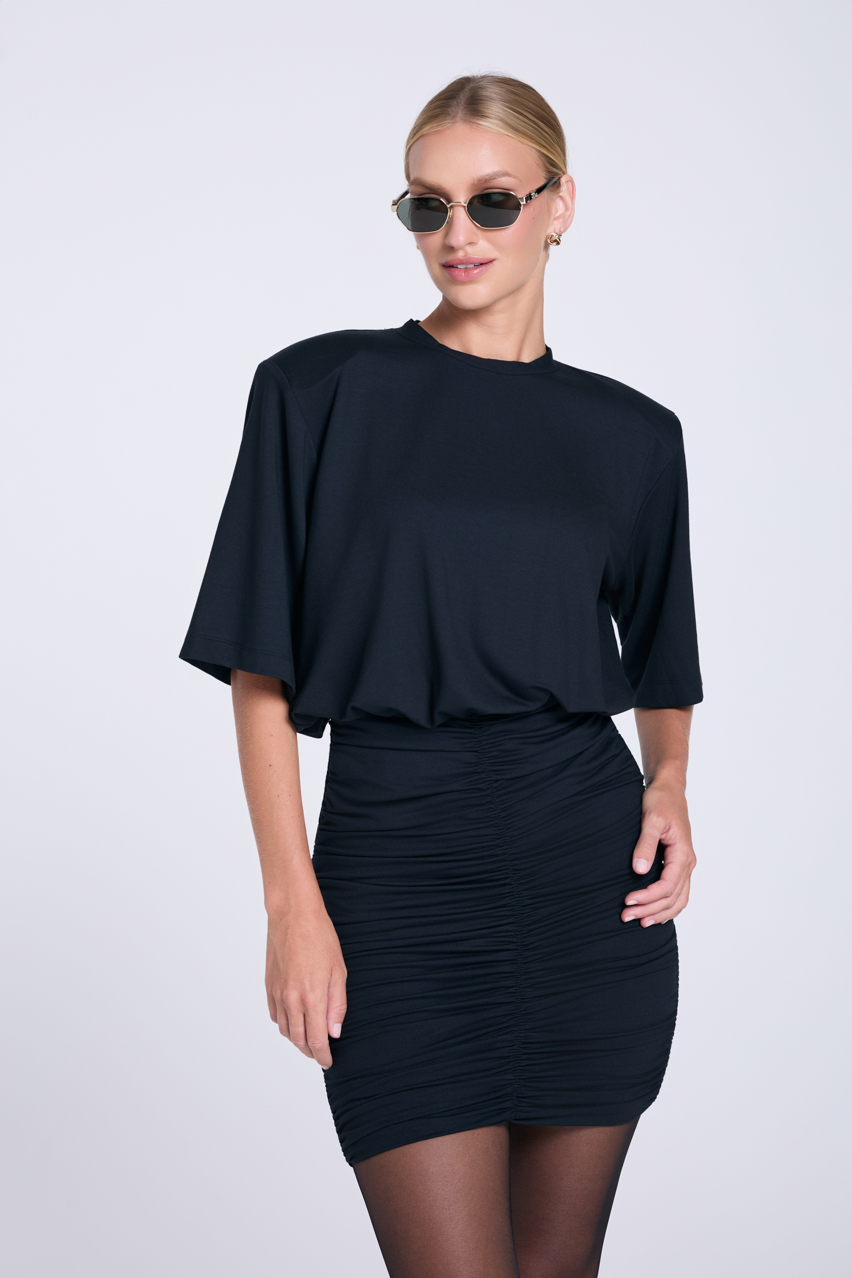 Czarna sukienka Agnes to propozycja, która łączy swobodę z wyrazistą formą. Uszyta z miękkiego mikromodalu, zapewnia komfort, a jednocześnie pięknie układa się na sylwetce. Luźna góra tej sukienki kontrastuje z dopasowanym, marszczonym dołem, który podkreśla linię bioder i nogi. Rękaw do łokcia i poduszkI na ramionach nadają całości nowoczesnego charakteru i odrobinę nonszalancji. To projekt, który przyciąga uwagę wyważonym połączeniem proporcji. Idealny zarówno na wieczorne wyjścia, jak i mniej formalne spotkania, kiedy chcesz wyglądać efektownie, ale bez przesadnej elegancji.
