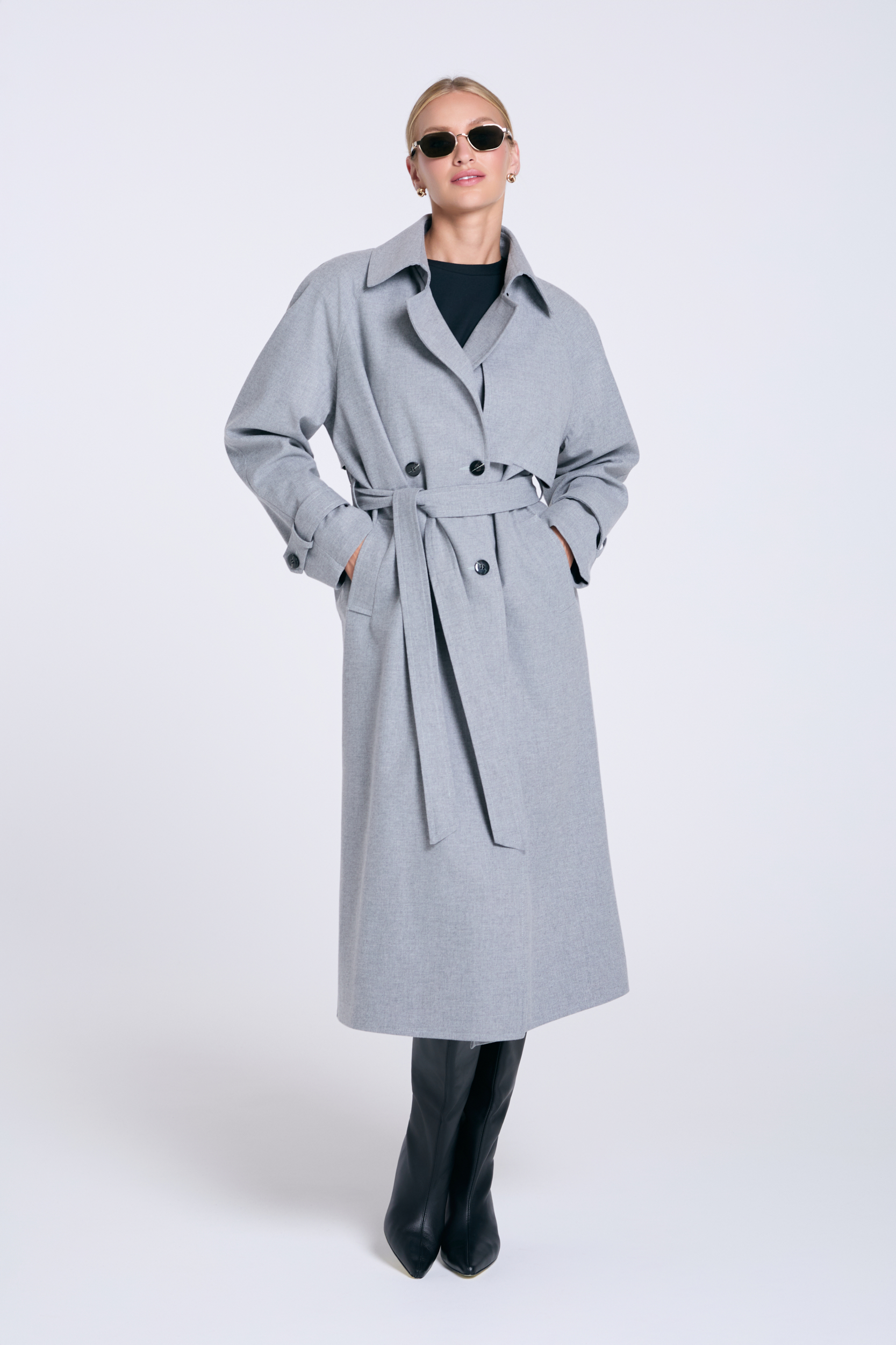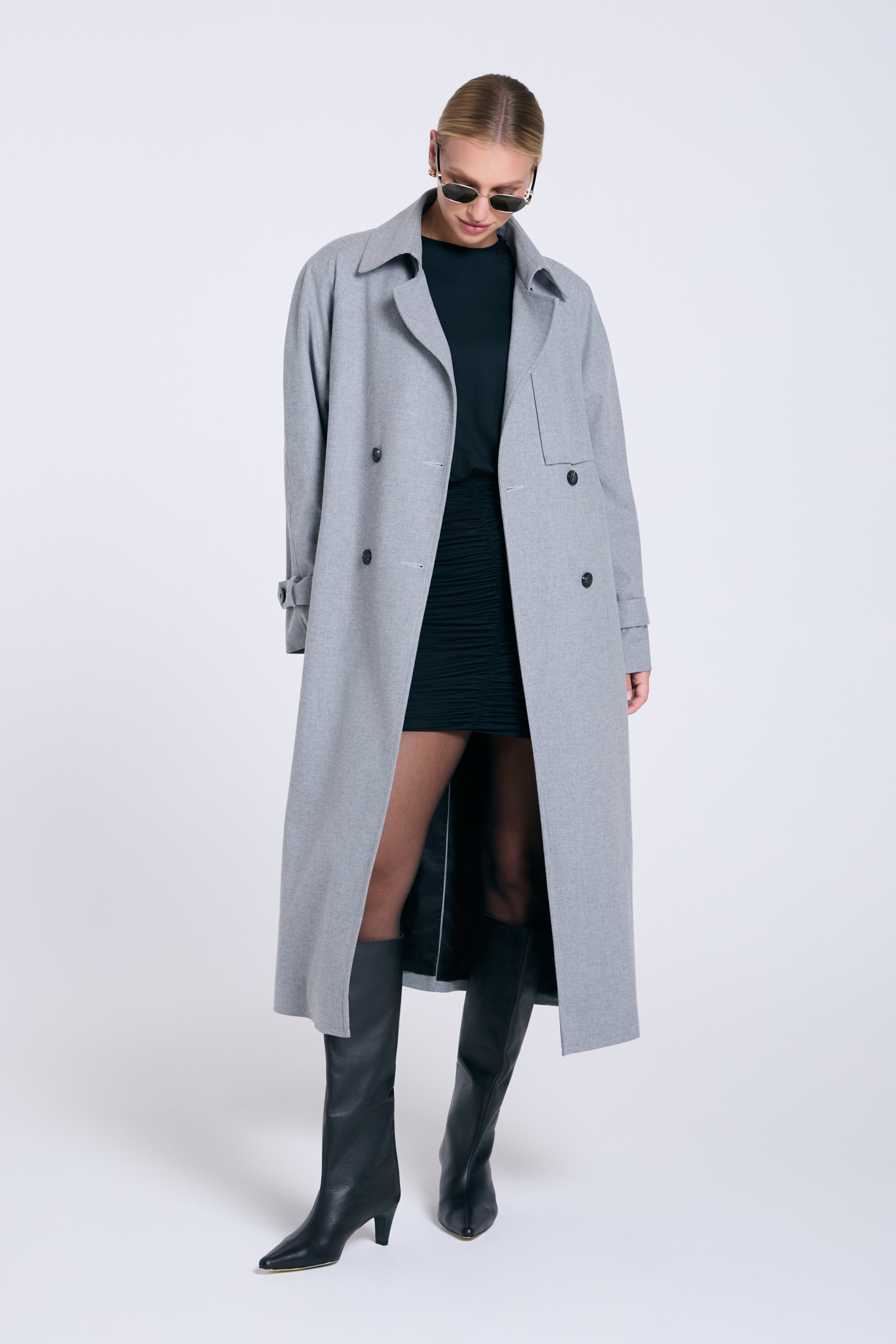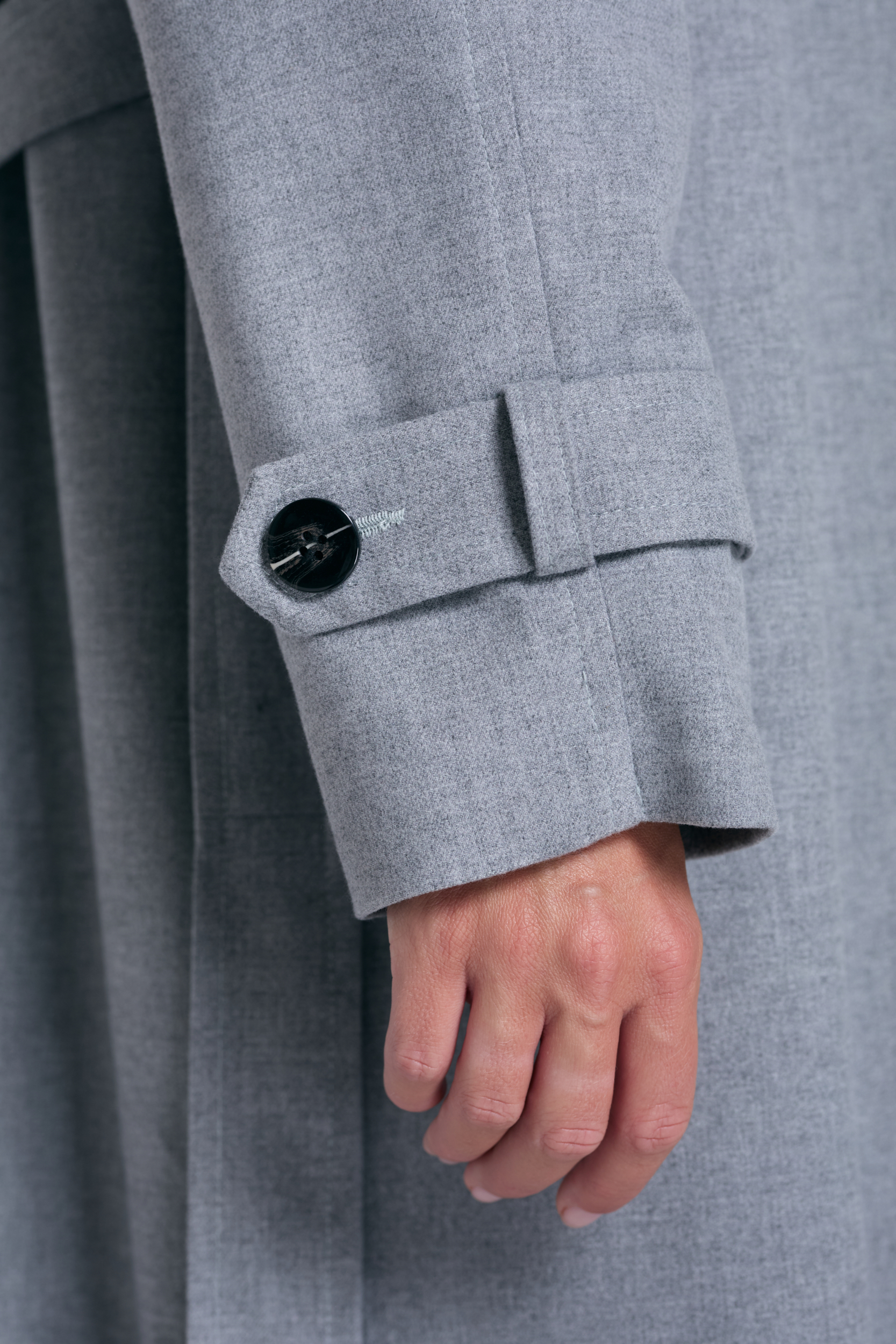 Szary trencz uszyty z wodoodpornej wełny Loro Piana to połączenie ponadczasowej formy i rzadko spotykanej jakości materiału. Włókno, z którego powstaje, kryje w sobie sekret technologii „Storm System” – naturalna wełna, która zachowuje miękkość i elegancję, a jednocześnie chroni przed deszczem i wiatrem. Długi fason i dwurzędowe zapięcie budują smukłą sylwetkę, którą dopełnia pasek wiązany w talii. Szylkretowe guziki wprowadzają szykowny akcent, a patki na rękawach podkreślają charakter trencza. Płaszcz posiada dwie kieszenie po bokach. Szarość w tej odsłonie nabiera nowoczesnej elegancji.