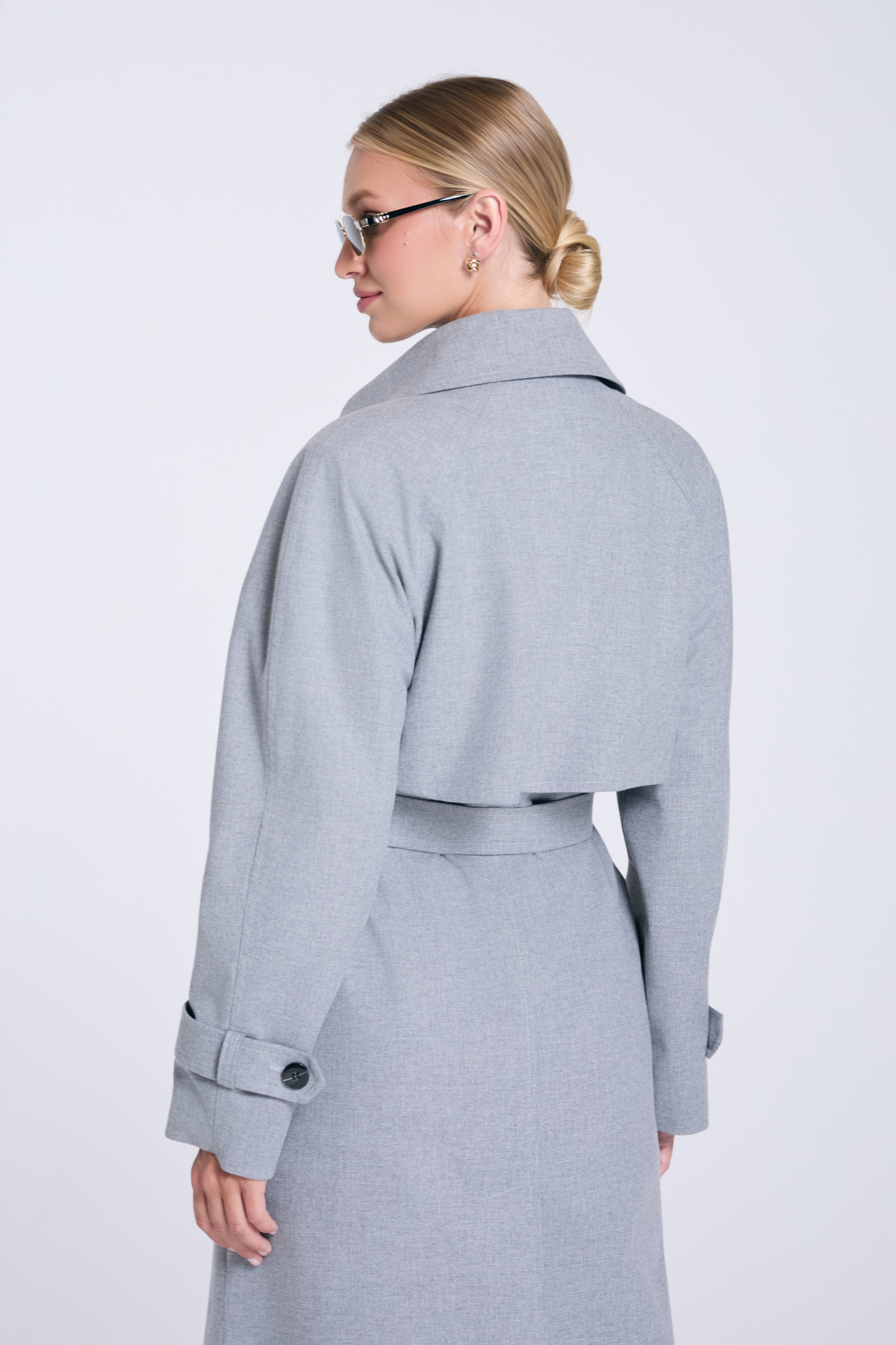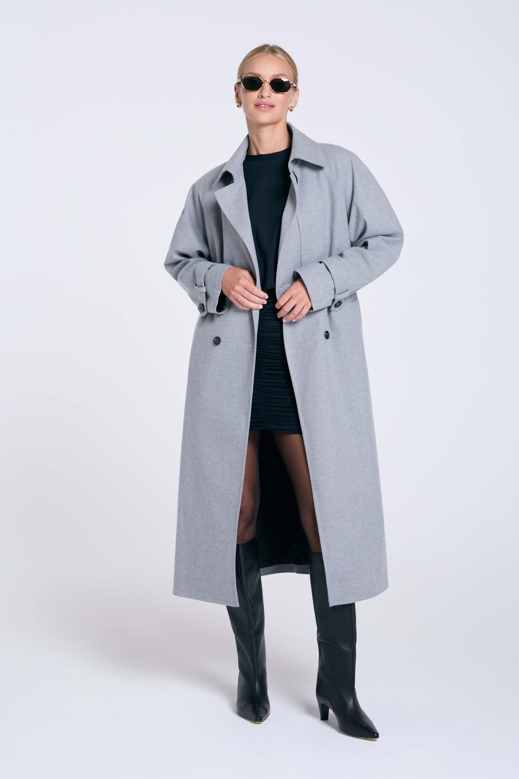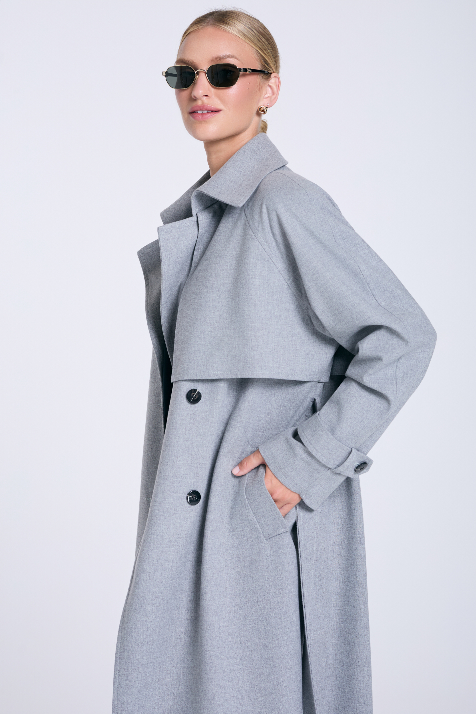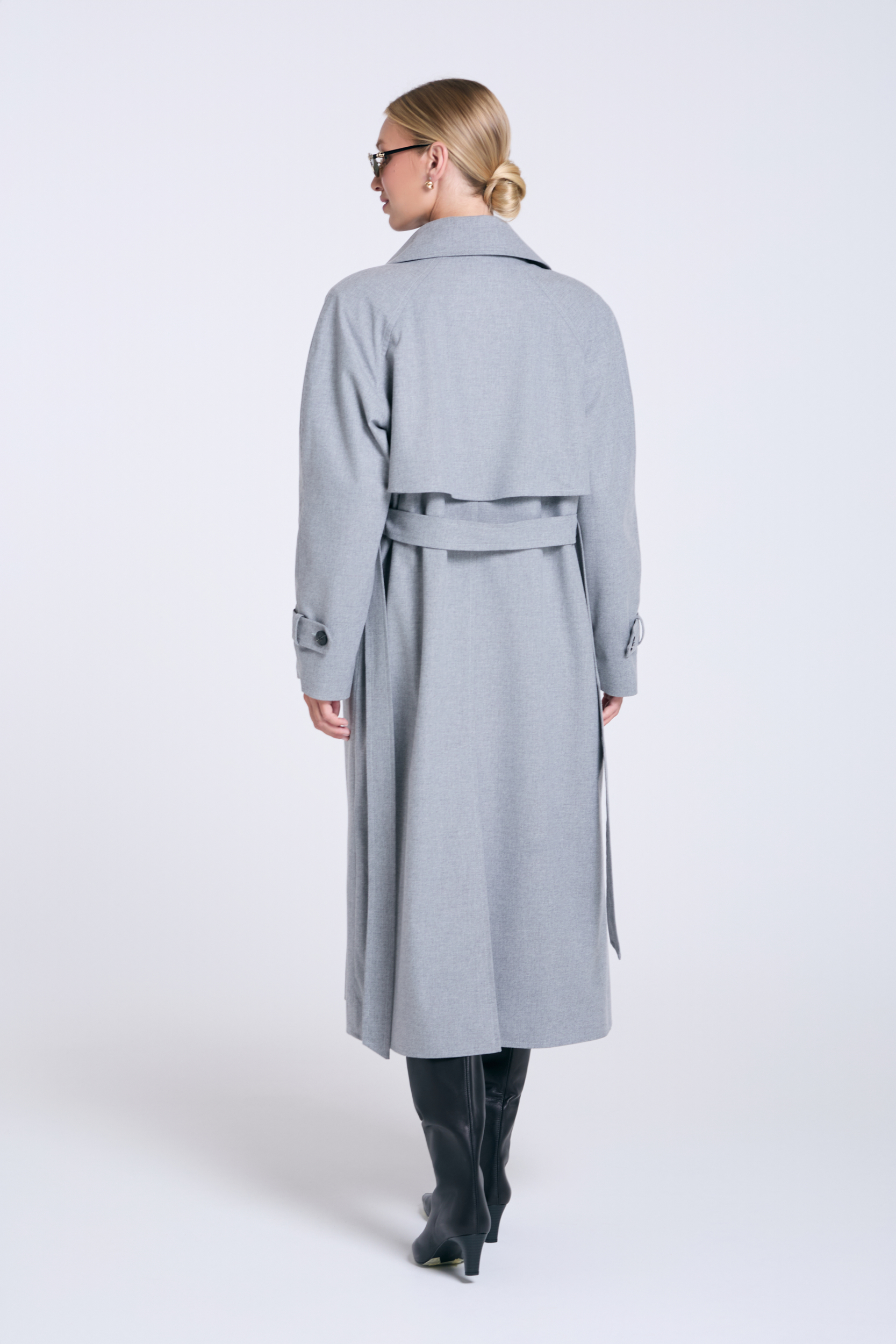 Szary trencz uszyty z wodoodpornej wełny Loro Piana to połączenie ponadczasowej formy i rzadko spotykanej jakości materiału. Włókno, z którego powstaje, kryje w sobie sekret technologii „Storm System” – naturalna wełna, która zachowuje miękkość i elegancję, a jednocześnie chroni przed deszczem i wiatrem. Długi fason i dwurzędowe zapięcie budują smukłą sylwetkę, którą dopełnia pasek wiązany w talii. Szylkretowe guziki wprowadzają szykowny akcent, a patki na rękawach podkreślają charakter trencza. Płaszcz posiada dwie kieszenie po bokach. Szarość w tej odsłonie nabiera nowoczesnej elegancji.